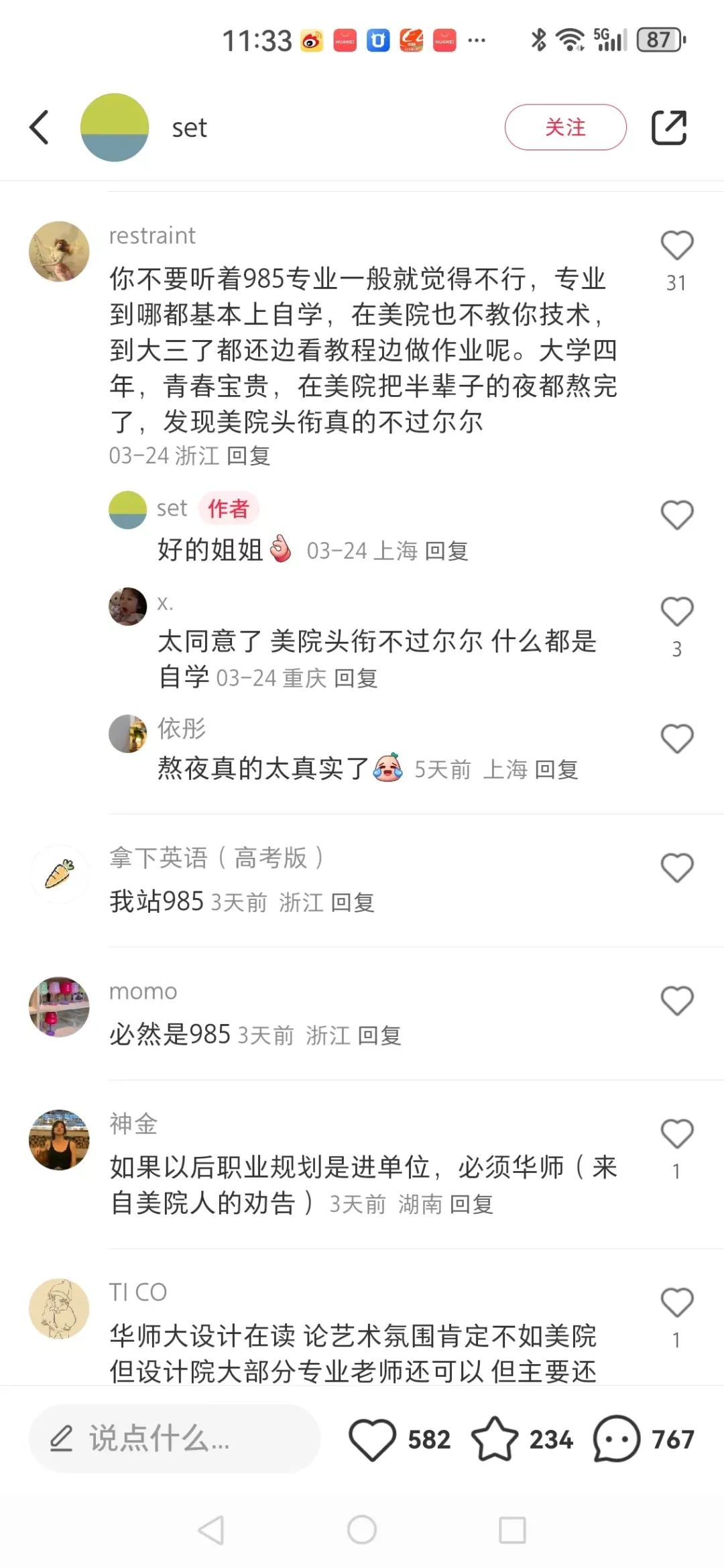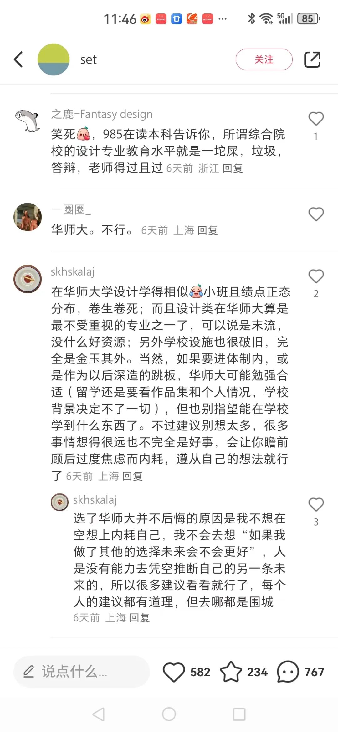 有时候我也去搜一搜,看看这些大学生们自己是如何评价的,有些家长也会从小红书上获得信息。有美院学生说上了美院后悔没去985、211的,也有985、211学生说后悔没选择美院的。
