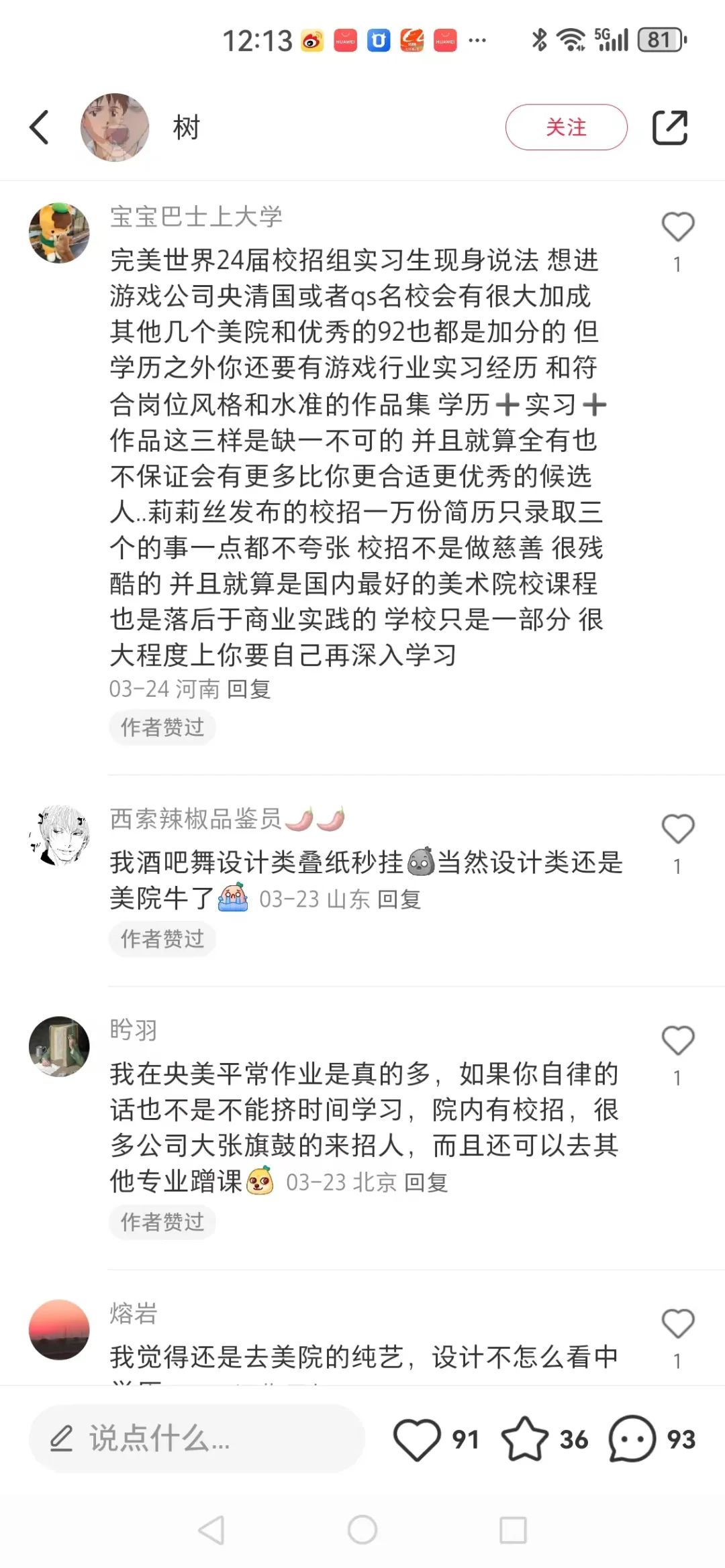 不少人认为985、211就业要好于美院,路子宽,但理由比较有意思,因为985、211转行方便,不容否认这个“优势”肯定是存在的,逻辑上也成立,但明显偏离了学美术的初衷,还没进大学读书呢,就考虑转行方便了,这个出发点让人感觉很奇怪,还没上战场就考虑怎么跑得快。