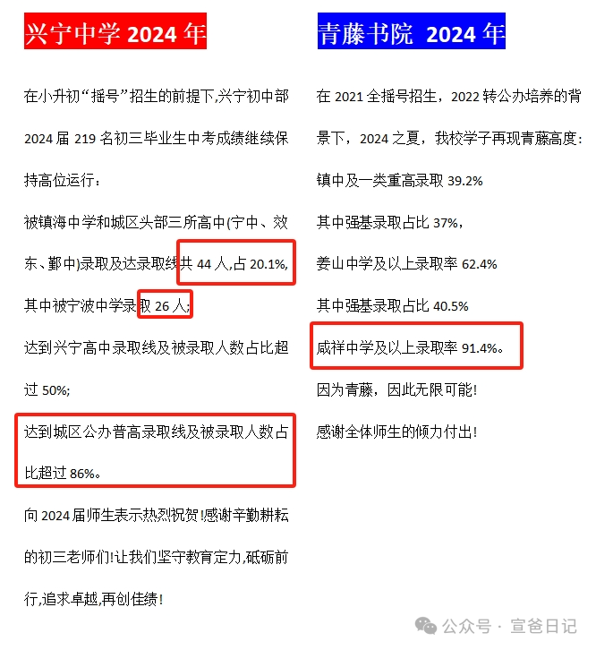 2024年宁波市区中考兴宁中学和青藤书院喜报对比: