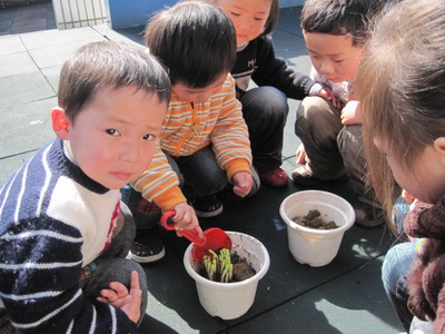 原本我们小朋友种大蒜,不过食堂里的大蒜头用的差不多了,于是我们就改种小葱了。前两天就和小朋友预热过,我们要种大蒜,所以今天让孩子们自己动手,兴致特别高,每个小朋友都跃跃一试,看,孩子们的动作还标准吧,先在盆里的泥土上挖个坑,再把小葱擦到土里,最后把旁边的泥土盖上,浇点水大功告成了。