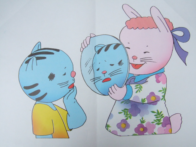 | 故事《小猫买镜子》 一天,小猫要买一面镜子,他对小兔姐姐说:“小兔姐姐, 我要买一面镜子。”小兔姐姐拿了一面小圆镜给小猫,小猫拿小 圆镜一照:“哎呀!这面不好,照出的脸不干净,请换一面。” 小兔姐姐换了一面小方镜给小猫,小猫拿小方镜一照:“哎 呀!这面也不好,照出来的脸还是不干净,请再换一面。” 小兔姐姐又换了一面大圆镜给小猫,小猫拿大圆镜一照: “哎呀!这些镜子都不好,照出来的脸都不干净。” 小兔姐姐看看小猫的脸对小猫说:“镜子是好的,是你的脸 不干净。“小兔姐姐拿了毛巾帮助小猫擦掉了脸上的黑点。小猫 拿镜子一照,照出脸儿真干净。小猫照着镜子笑了,高高兴兴地 买了一面镜子。 宝宝,故事听完了,现在我们一起来学学洗脸吧! 擦眼睛--擦鼻子--擦嘴巴--别忘了擦耳朵--再把 小脸全部擦一遍。瞧,我们的小脸多干净呀!在 家要和在幼儿园一样棒,学会自己洗脸哦! |