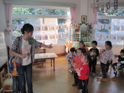 谢老师给我们小朋友带来了一个好玩的游戏,我们小朋友都变成了可爱的小动物,但是我们要上动物列车,必须要念一个魔法咒语,如果对了,动物列车就会让我们上车。如果小朋友变成了小猫,那他必须念出咒语:“我是小猫,小猫小猫喵喵叫,坐上火车快快跑。”您瞧,孩子们都上车了。乘着谢老师的动物列车出发了。