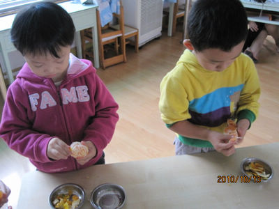 朱老师带我们小朋友去四楼上公开课,我们通过看一看,剥一剥,尝一尝,我们发现了橘子的很多秘密。现在的橘子虽然皮的颜色不一样,但是剥开来,橘肉都是黄黄的,味道有酸的也有甜的,我们尝过了好吃的橘子,小朋友们把这份快乐也带给了客人老师,让他们也来品尝橘子的味道。