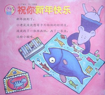 第二天早上,波波听到敲门的声音,打开门一看,“哇!好大的一张贺卡,上面画着小老鼠最喜欢的奶酪。”小猫咪、小黑熊、小红鸟和小兔子从卡片后面伸出头来,开心地说:“波波,祝你新年快乐!”