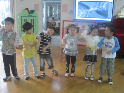 备注:学完儿歌,小朋友说这个还有一首歌曲,自己就哼了起来,于是孩子们就听着音乐自己舞动起来,请欣赏他们的表演。
