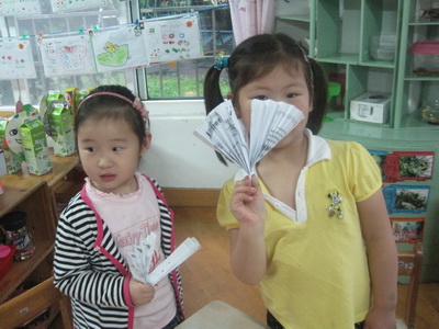 夏天到了,各种降暑的工具都上市了,我们小朋友用小手制作了纸扇,既环保有经济,孩子们还能想出和扇子玩的其他花样,一物多用,真是太能干了。