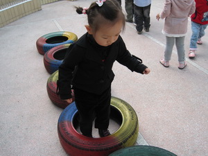 老师告诉我们,在轮胎上行走,不但能锻炼我