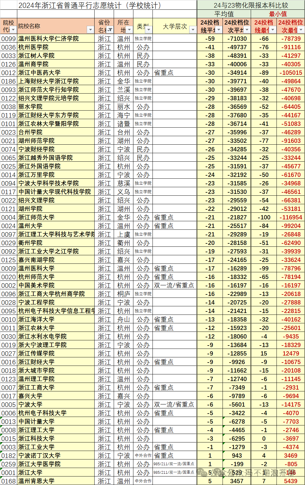 浙江省内52所高校,物化限报专业投档分数平均值上涨的仅3所,分别是浙江大学、浙江大学医学院、宁波诺丁汉大学、温州肯恩大学。