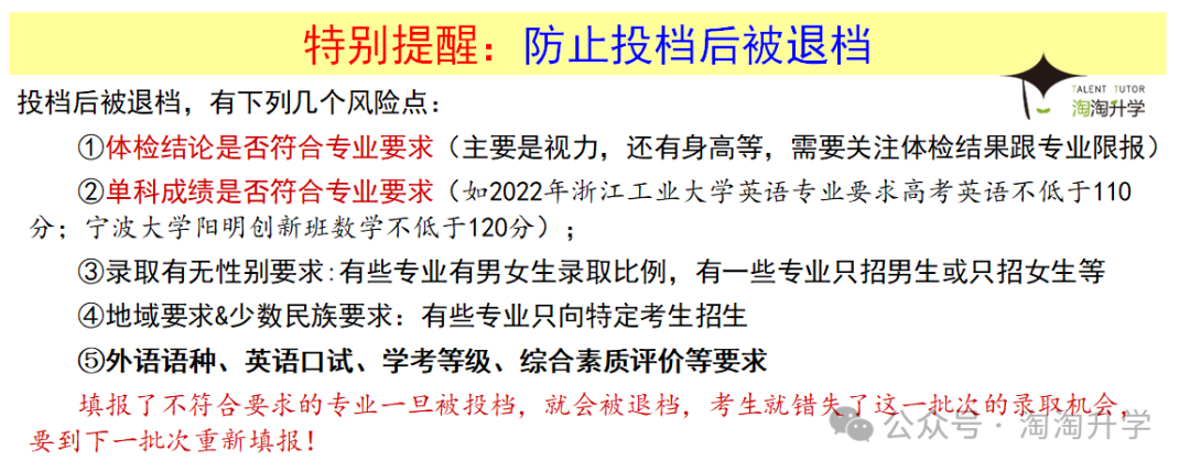 一次投档机会:考试院在投档的时候,只看学生的高考分数和位次,轮到这个位次号考生投档时,只要该考生所填报的志愿中还有招生计划,考生就一定会被投档到该高校。高校收到投档考生信息后,会查看考生的高考体检结果。如果所报专业及其体检结论符合上面说的“专业可不予录取”,考生就会被高校退档。一个段次每个考生一次投档机会。
